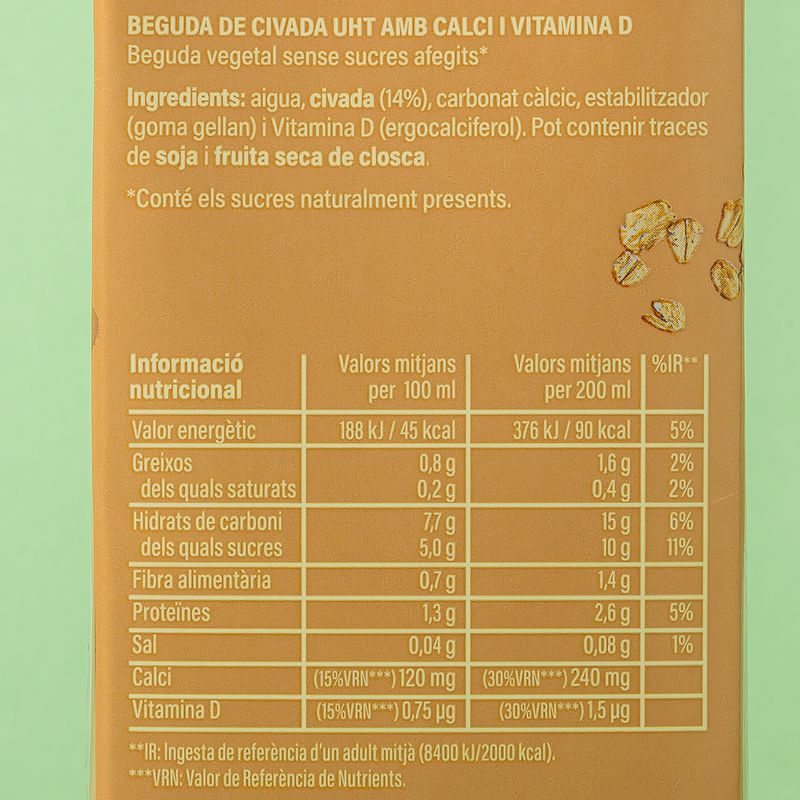 La beguda de civada que t'oferim a la nostra Botiga Online és l'alternativa ideal a la lactosa i la llet. Elaborada amb ingredients 100% naturals, conté un alt contingut de vitamina D i de calci. Emporta't aquesta beguda vegetal de civada i gaudeix del seu agradable sabor.