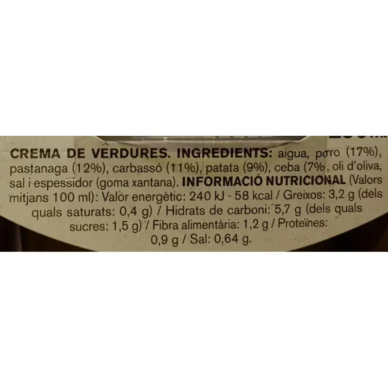 Crema elaborada amb una selecció de diferents verdures amb oli d’oliva. Sense gluten, colorants ni conservants.