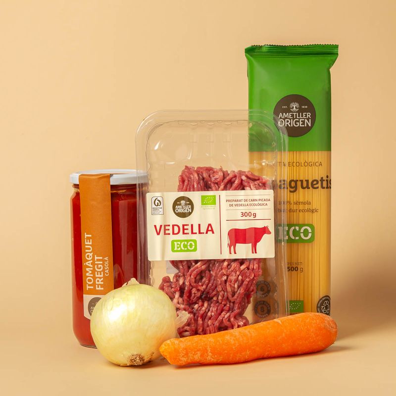 Composició: -Picada de vedella ecològica 300g -Tomàquet fregit Ametller Origen 690g -Ceba dolça 250g -Pastanaga 105g -Spaghetti Ametller Origen 500g *La imatge únicament correspon a un suggeriment de presentació. En cas de manca de stock, els productes d'aquest lot poden ser substituïts per altres productes equivalents, de valor similar o superior.