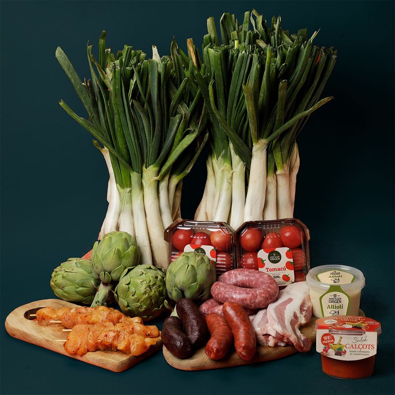 Composició: -Salsa de calçots AO 250g -Allioli Ametller Origen 135g -Manat de calçots 2u. -Carxofa extra 1kg. -Tomacó I safata 300g -Panxeta Ral Ametller Origen 320g. -Botifarra crua Ametller Origen 2u. -Morcilla con cebolla 2u. -Chorizo fresco ibérico 2u. -Pinchos de pollo 3u. *La imatge únicament correspon a un suggeriment de presentació. En cas de falta de stock, els productes d'aquest lot poden ser substituïts per altres productes equivalents, de valor similar o superior.