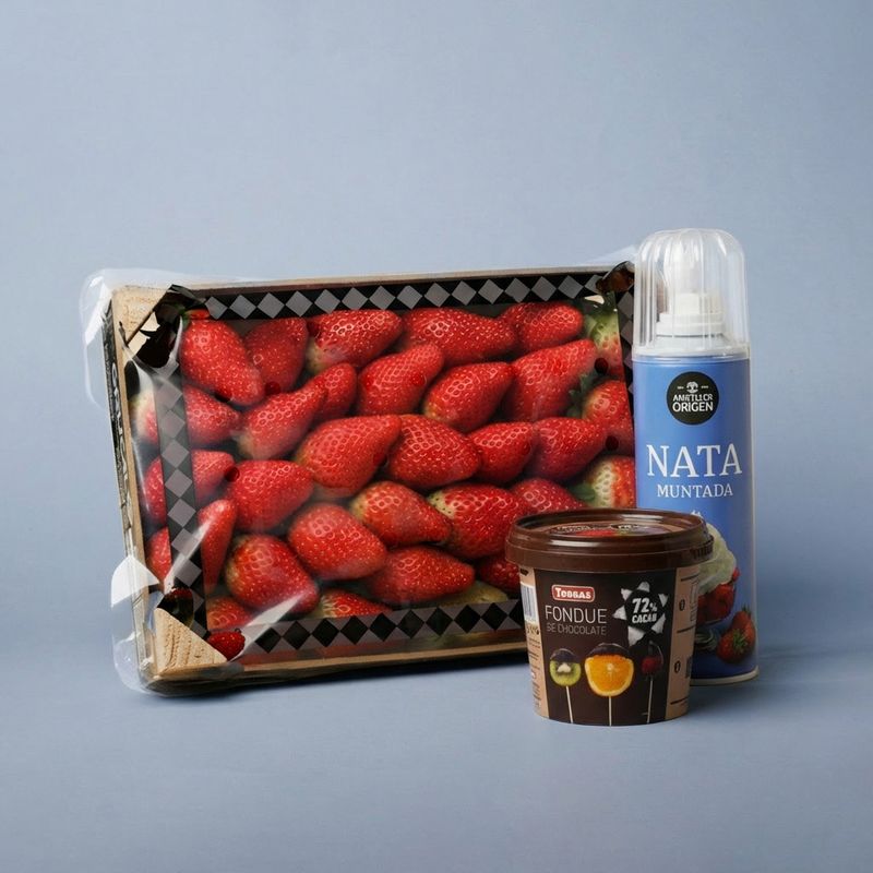 Composició: - Maduixot caixa 1kg. - Nata Ametller Origen 250g. - Fondue xocolata 70% cacau Torras 160g *La imatge únicament correspon a un suggeriment de presentació. En cas de falta de stock, els productes d'aquest lot poden ser substituïts per altres productes equivalents, de valor similar o superior.