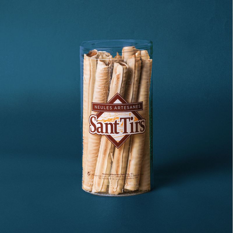 Pot de neules grosses amb una capa de xocolata blanca, elaborades amb el procés tradicional.