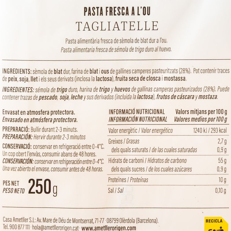Els tagliatelle a l’ou de la nostra Botiga Online t’encantaran. A diferència d’altres varietats de pasta, aquesta s’elabora amb ous frescos, donant un sabor autèntic, un color únic i una textura suau i sedosa. Et recomanem combinar-los amb salses riques i cremoses com ara la salsa Alfredo, la salsa carbonara o la salsa bolonyesa. Compra online aquests tagliatelle a l’ou i gaudeix de l’autèntica pasta italiana.