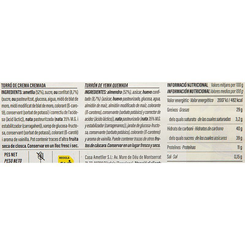 Valdrà la pena esperar a les postres per tastar el nostre torró de crema cremada. Gaudeix del sabor d’aquest dolç de Nadal tan tradicional elaborat artesanalment. Tot el que pots esperar dels torrons d'Ametller Origen elaborats per Torrons Vicens. Aquest Nadal, a la nostra Botiga Online, podràs comprar aquest torró de crema cremada.