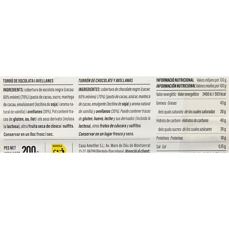 Valdrà la pena esperar a les postres per tastar el nostre torró de xocolata i avellanes. Gaudeix del sabor d’aquest dolç de Nadal elaborat amb mètodes artesanals i els millors productes. Tot el que pots esperar dels torrons d'Ametller Origen elaborats per Torrons Vicens. Aquest Nadal, a la nostra Botiga Online, podràs comprar aquest torró de xocolata i avellanes.