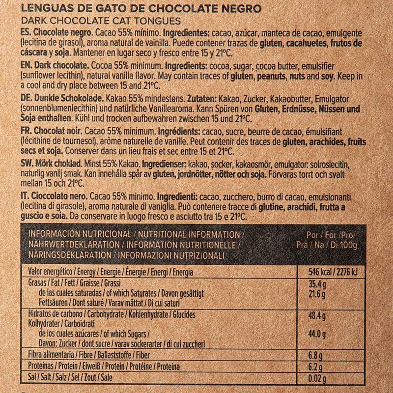 Chocolate negro con un 60% de cacao elaboradas artesanalmente porBlanxart en forma de lenguas de gato.