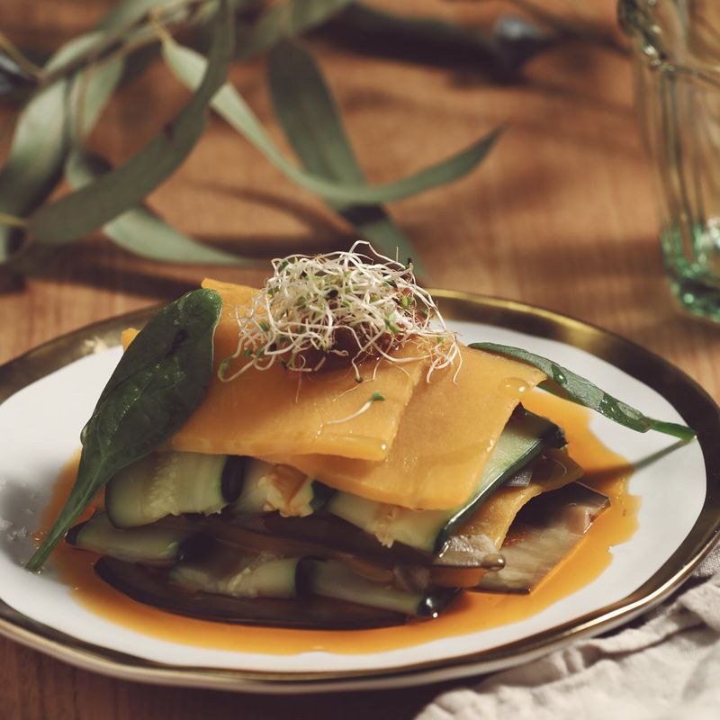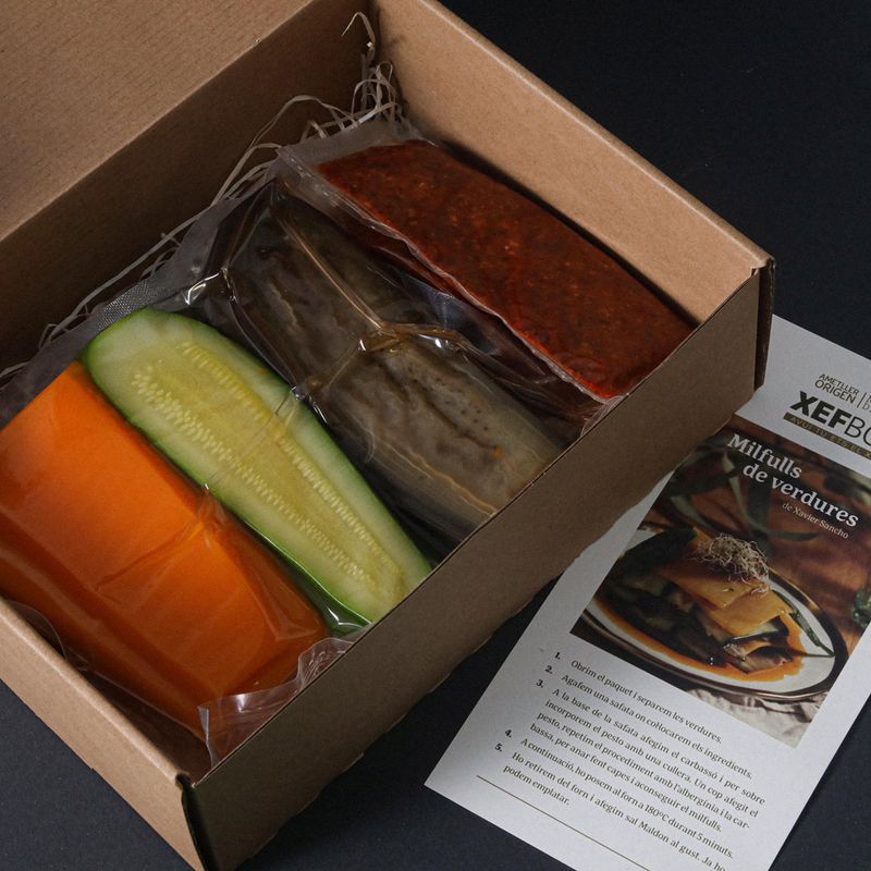 Qué es CHEF BOX?Son cajas que contienen una receta semi elaborada lista para manipular yhacerte sentir un verdadero chef.Están preparadas para dos personas, sólo te faltará el ÑAM!Saca el chef que llevas dentro!Mil hojas de verduras- Verduras de temporada- Pesto rojo